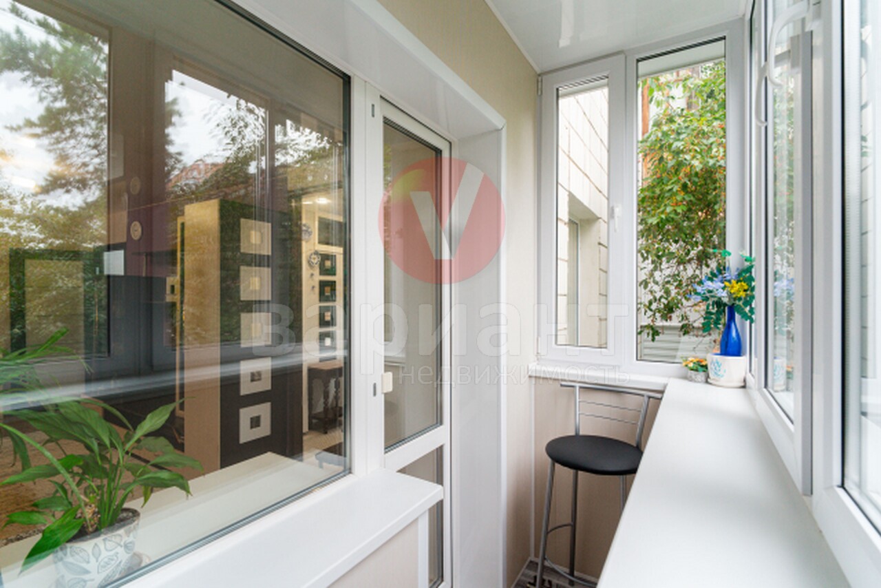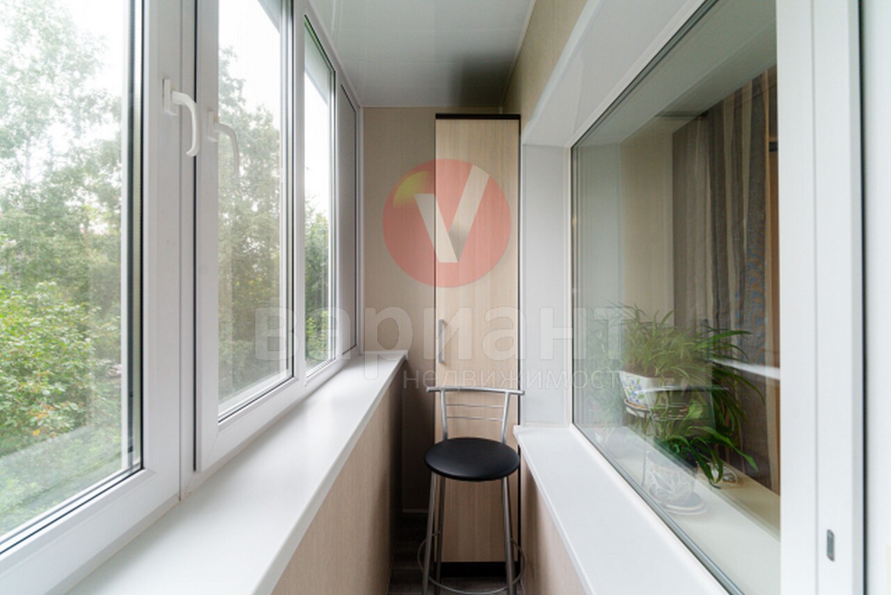 Балкон застеклен ПВХ, стеклопакеты в комнате и кухне, пол — линолеум + кафельная плитка. Новая сантехника.