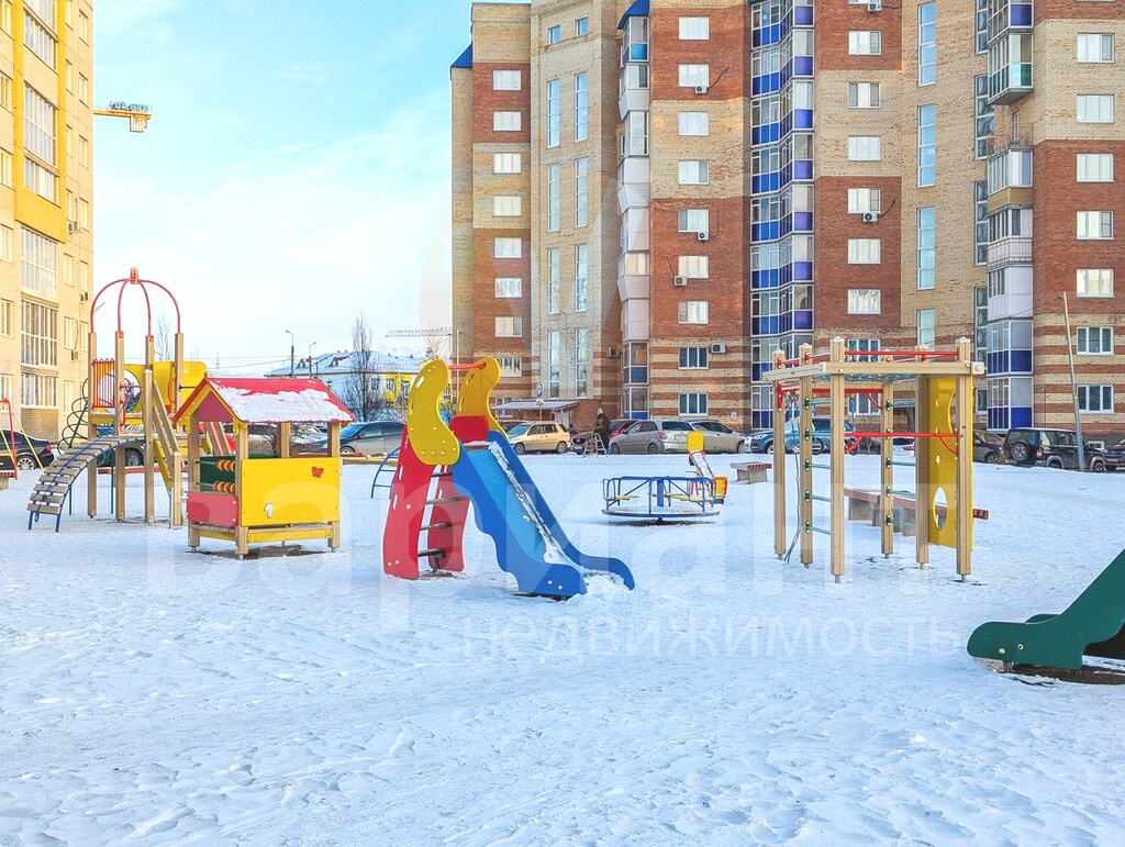 Благоустроенный двор с новой детской площадкой и множеством парковочных мест.