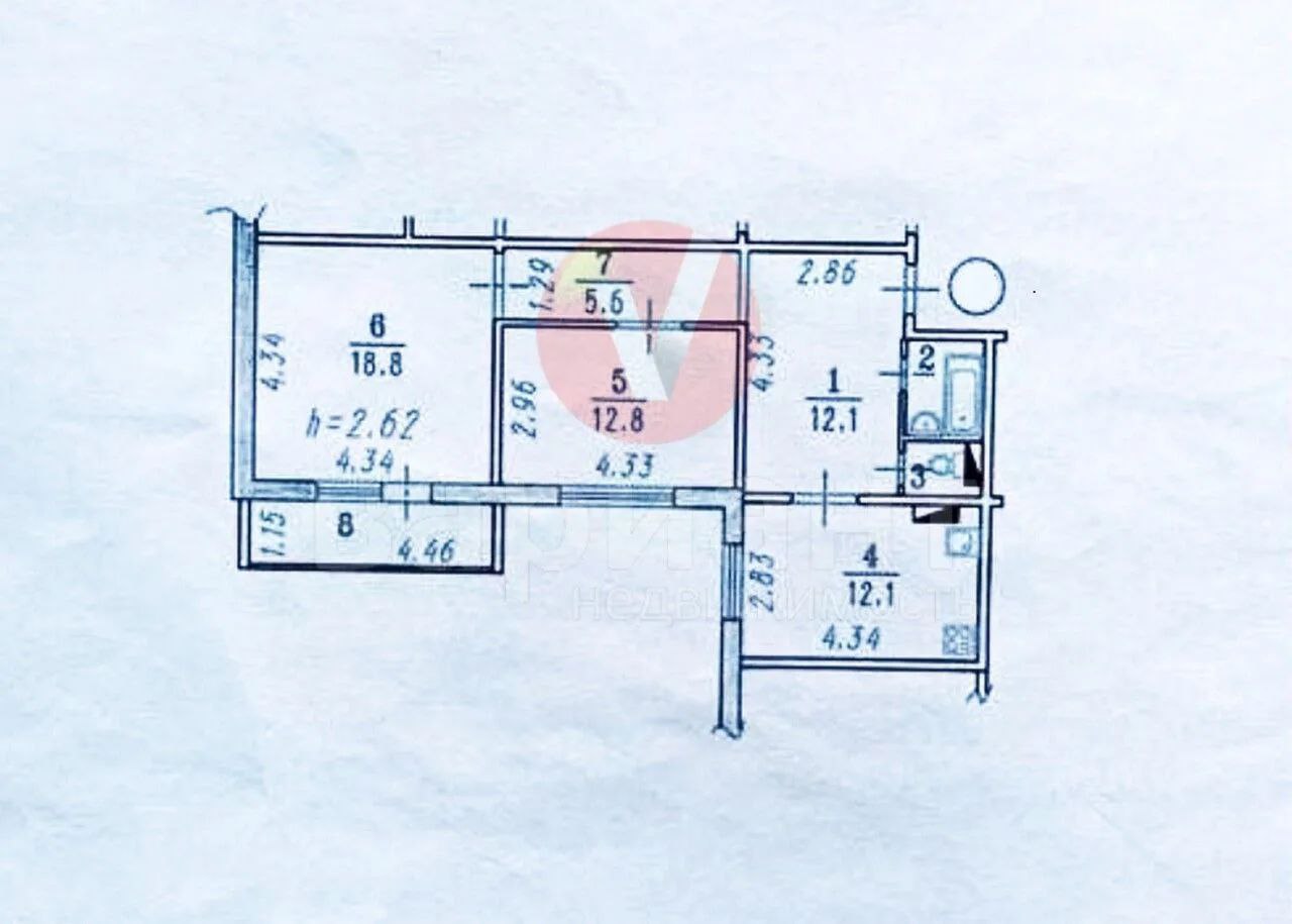 Кухня 12,1 кв метров. Высота потолков 2,62 м. Межкомнатные двери из натурального массива. Сан-узел раздельный, отделан кафелем. Пол – ламинат.