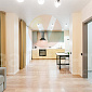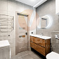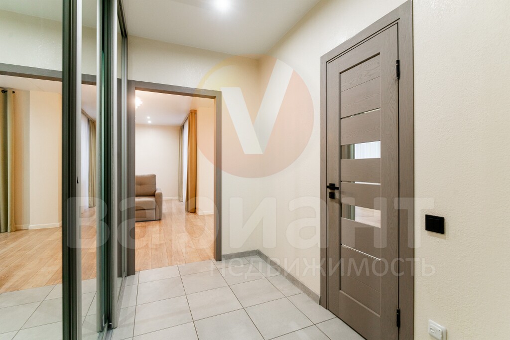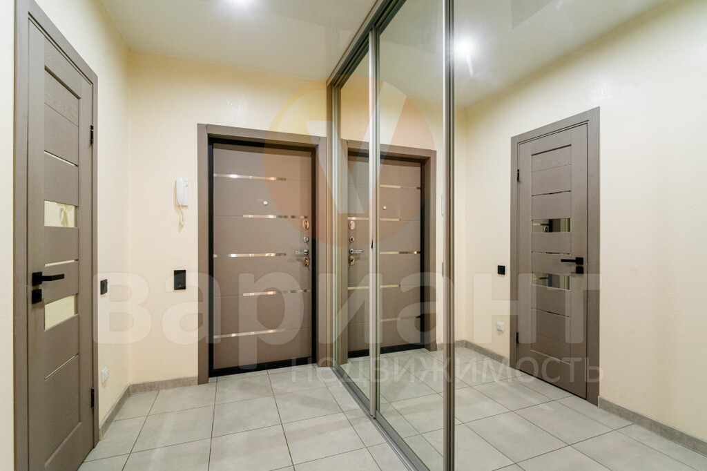 Просторный уютный коридор с системой теплого пола. Стены оформлены фактурной отделкой в светлых тонах, практичное решение для интерьера. Полы выровнены, по периметру покрыты арт-винилом.