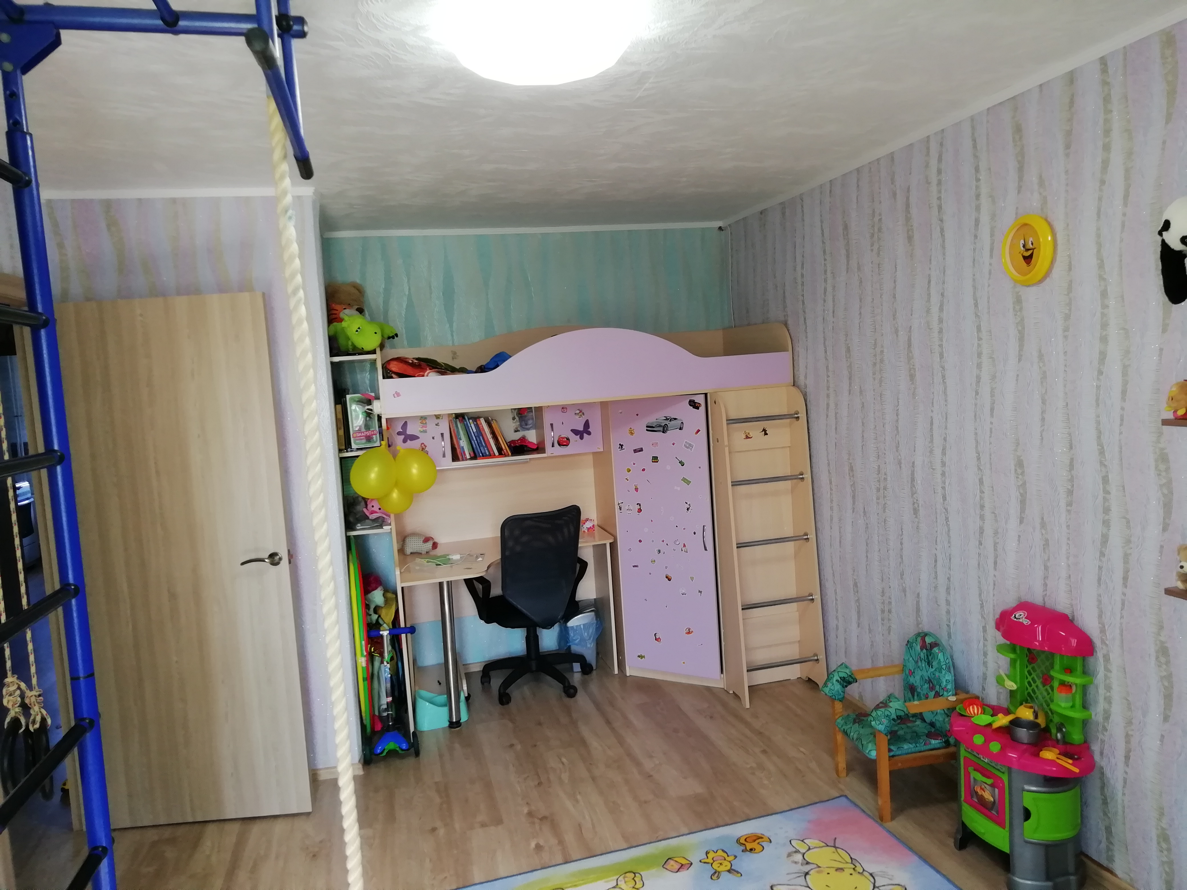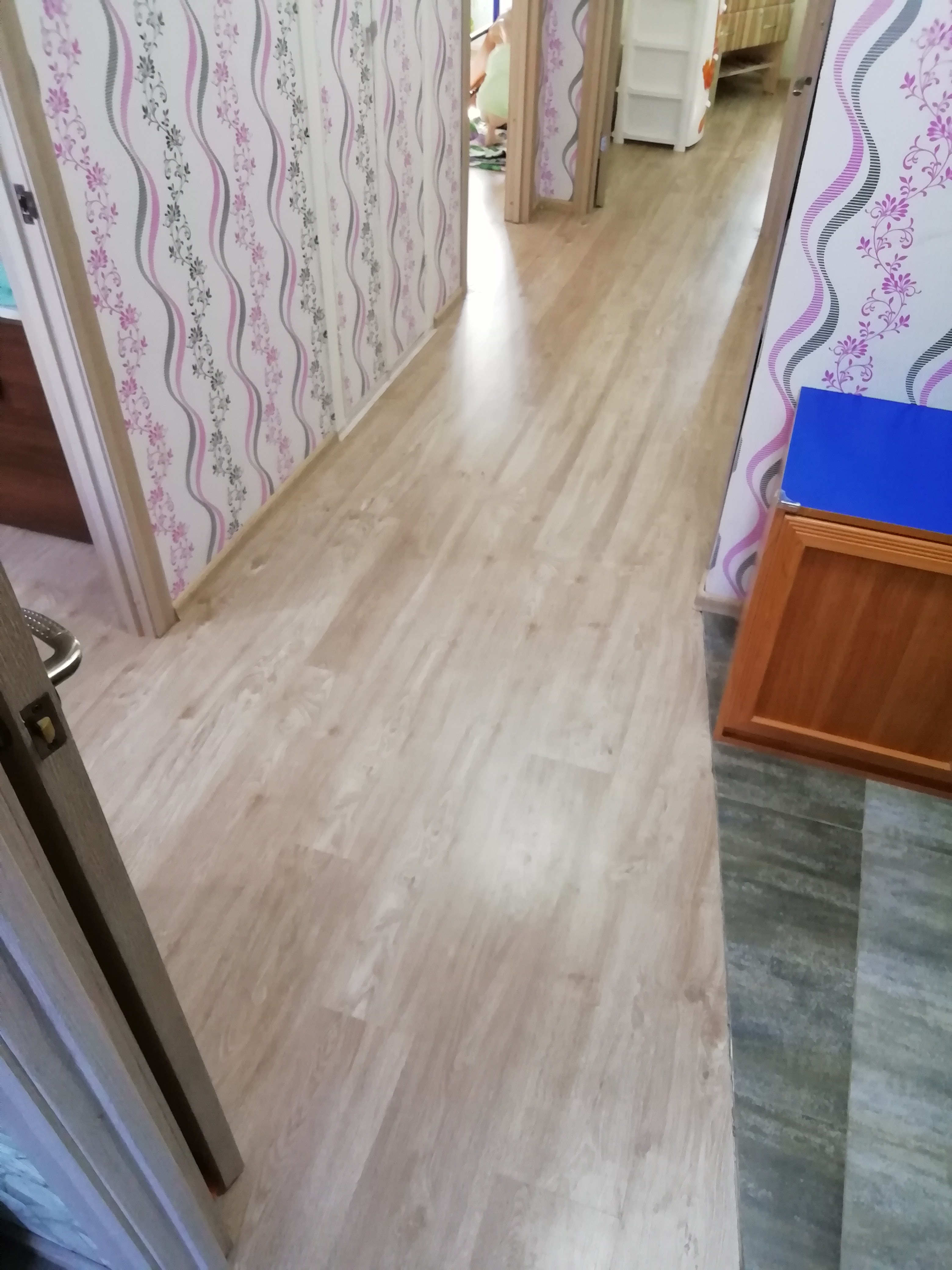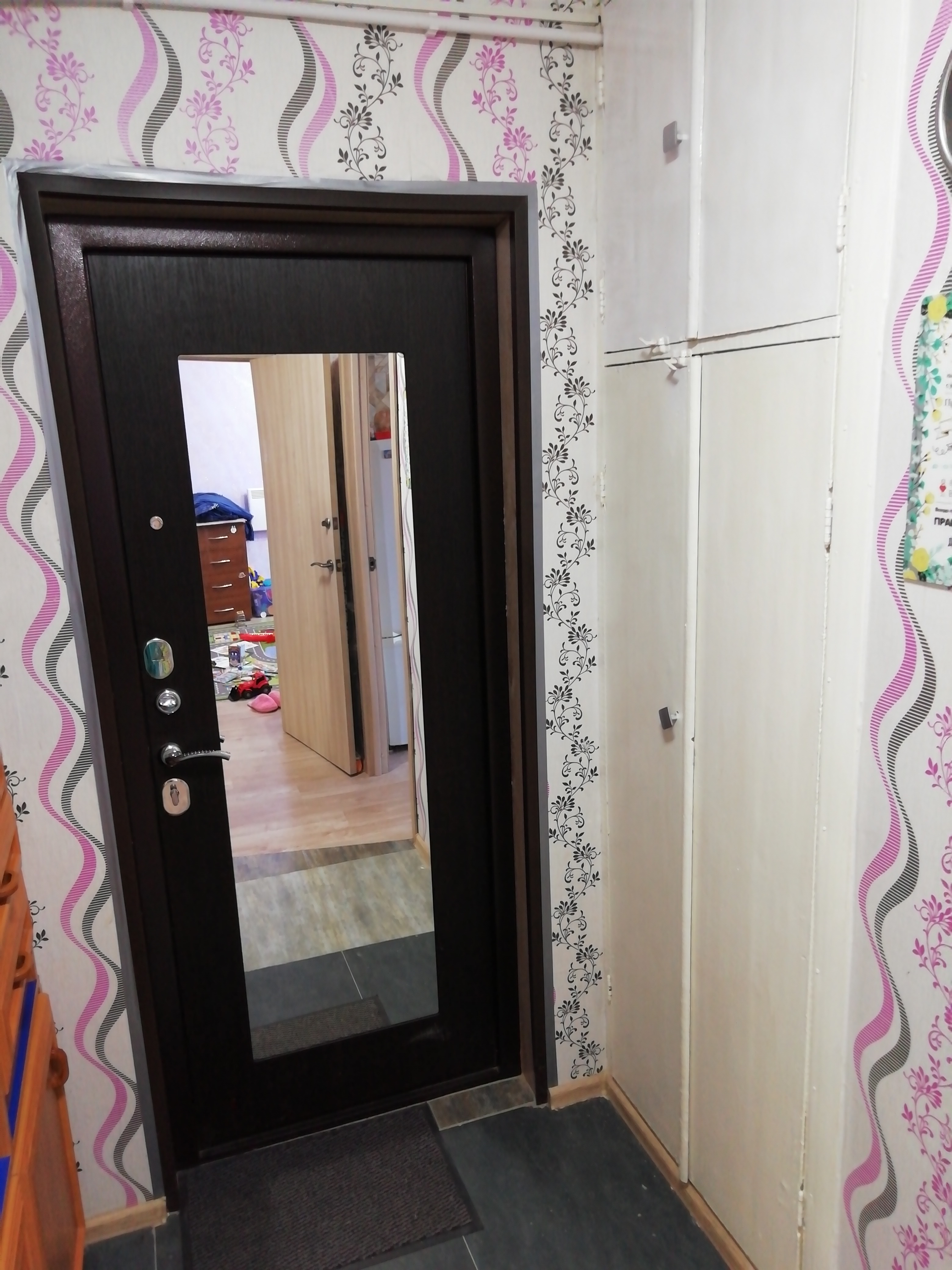 Новые межкомнатные и входная двери, с тепло и шумо изоляцией. Ламинат постелен одним ковром. Под ламинатом пол утеплен.