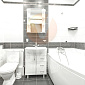 Большая ванная зона, полностью облицована керамической плиткой и наполнена качественной сантехникой.