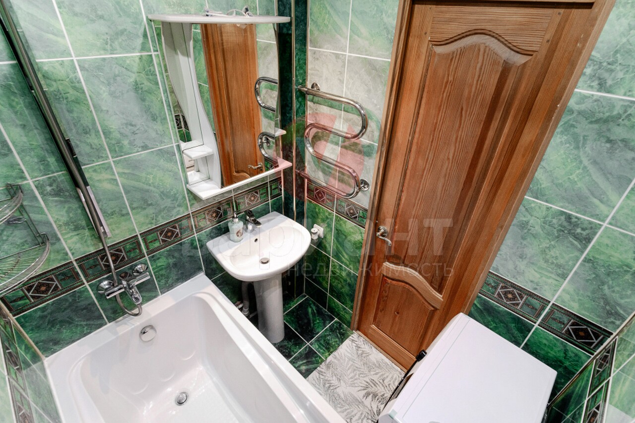 Отличное состояние. Кухонный гарнитур из массива дерева. Установлен большой шкаф-купе. Санузел раздельный, отделан современным кафелем. Новая — сантехника, окна — ПВХ, пол — линолеум.